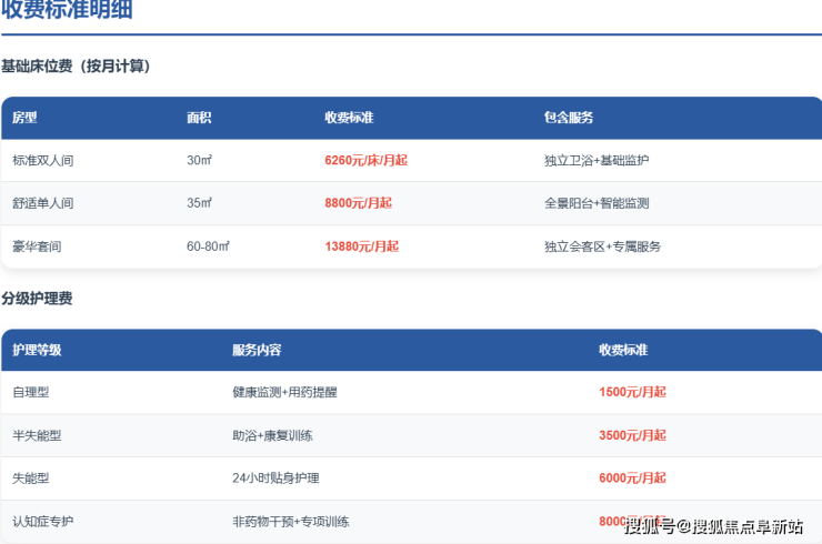 中高端档位:6260元/月起至18880元/月,包含单人间/套房住宿、个性化护理方案、专属健康监测等增值服务