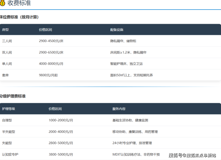总费用= 床位费 + 护理费 + 膳食费。以选择双人间、护理等级为半失能的长者为例,月度总费用大致在7200 - 11500元区间。