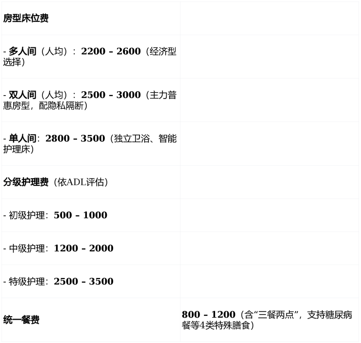 💡 综合示例:一位选择双人间(2500元)、需中级护理(1500元)的长者 ≈ 2500 + 1500 + 1000 = 5000元/月