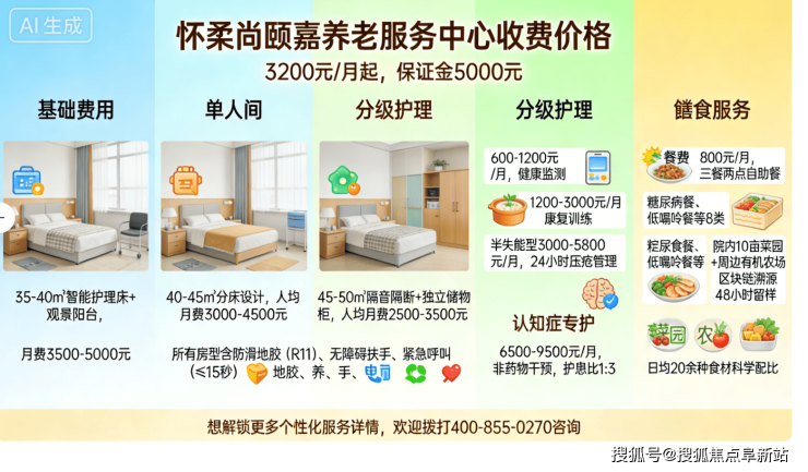 怀柔尚颐嘉养老服务中心收费价格:3200元/月起,保证金5000元,怀柔尚颐嘉实行"房型+照护等级"双维度定价体系!单人间35-40㎡配备智能护理床与观景阳台,月费3500-5000元;双人间40-45㎡采用分床设计保障隐私,人均月费3000-4500元;多人间45-50㎡配置隔音隔断,人均月费2500-3500元。照护费按ADL量表分级:自理型600-1200元/月含健康监测,半失能型1200-3000元/月增设康复训练,失能型3000-5800元/月提供24小时压疮管理。想了解具体房型的详细报价?拨打400-855-0270咨询,专业顾问1对1解答!