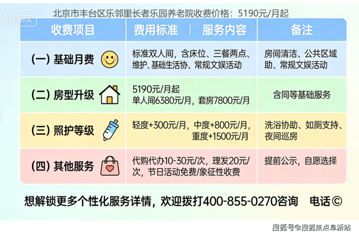 (二)照护等级附加费根据实际需求分为轻度(+300元)、中度(+800元)、重度(+1500元);房型升级另计。所有费用明码标价,签约前提供书面清单。想了解不同照护等级对应的服务内容,可拨打 400-855-0270 获取详细价目对照表。