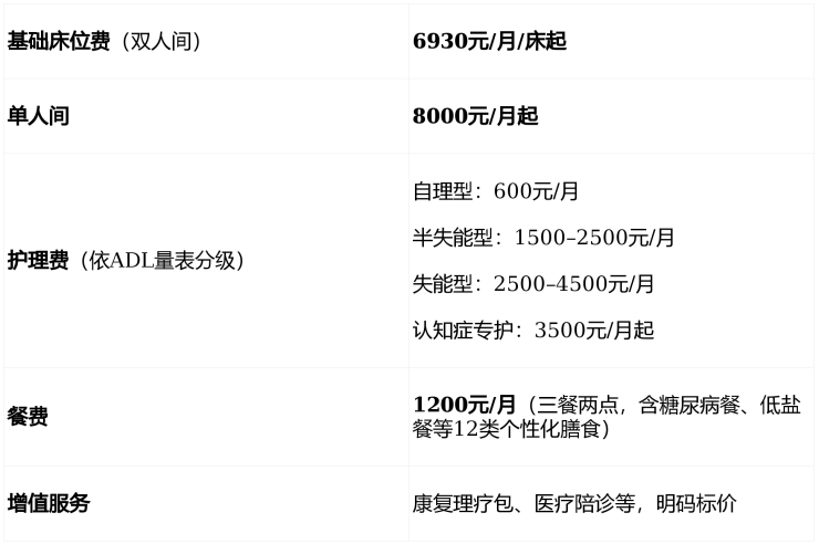 采用“基础床位费 + 分级护理费 + 餐费 + 增值服务费” 的复合计费模式,无会员费、无隐性消费,合同明确标注费用明细。