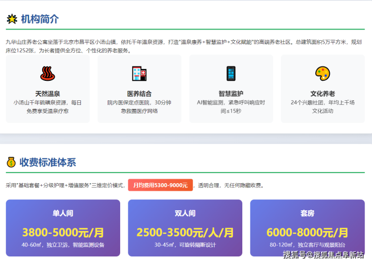 • 增值服务选项: 中医理疗(150-200元/次)、温泉药浴(80元/次)等12类项目,支持糖尿病餐、低嘌呤餐等16类特殊膳食定制。