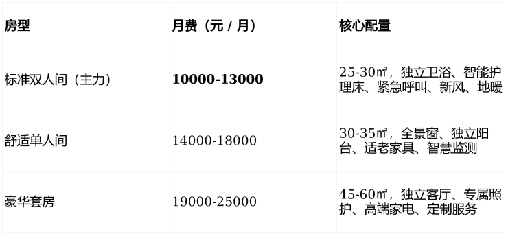 采用 **“床位费 + 分级护理费 + 餐费”** 一体化定价,10000 元 / 月起,含住宿、三餐三点、基础康养、文娱、保洁等,支持医保 / 长护险结算。