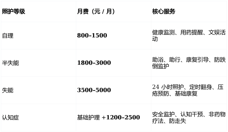 1. 综合月费(床位 + 基础护理 + 餐费)