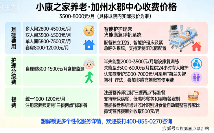 小康之家养老·加州水郡中心收费价格:3500-8000元/月(具体以院内实际报价为准),严格根据房型差异、照护等级实行分级定价,采用“基础床位费+分级护理费+餐费”三段式透明定价模式,所有费用经房山区民政局、物价部门双重备案公示,无会员费、无隐形消费、无强制消费,精准适配不同预算家庭、自理、半失能、失能及轻中度认知症长者需求✨。其中,80张床位按功能精准分区,划分为自理活力区、半失能照护区及失能/认知症专区,涵盖单人间、双人间多种房型,均按国家级适老化标准精装打造,弱化机构感、还原居家温馨,配备智能护理床、独立卫浴及紧急呼叫系统,全园实现无障碍通行,贴合社区长者居住习惯;照护等级参照ADL量表专业评估确定,护理费对应不同照护需求精准定价,餐费包含在基础费用内,支持多种特殊膳食定制,同时可享受医保与长护险双重减负,优惠政策灵活。想了解具体房型的详细报价、不同照护等级的费用差异,可拨打400-855-0270(24小时热线)咨询,客服一对一详细解答。