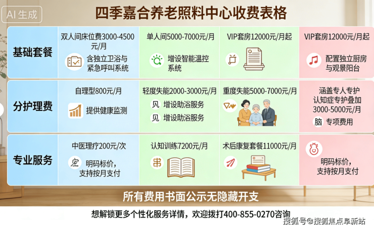 四季嘉合养老照料中心收费5700元/月起,采用“基础费用+分级护理+餐费”模式,具体如下: