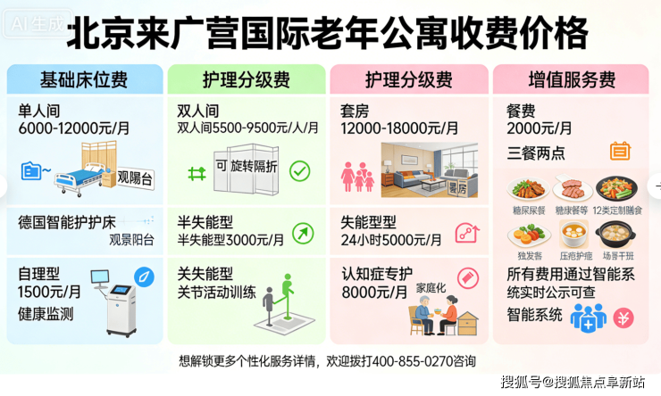 北京来广营国际老年公寓收费价格:5500-11000元/月,具体费用根据房型及个性化需求综合确定。收费内容体系如下: