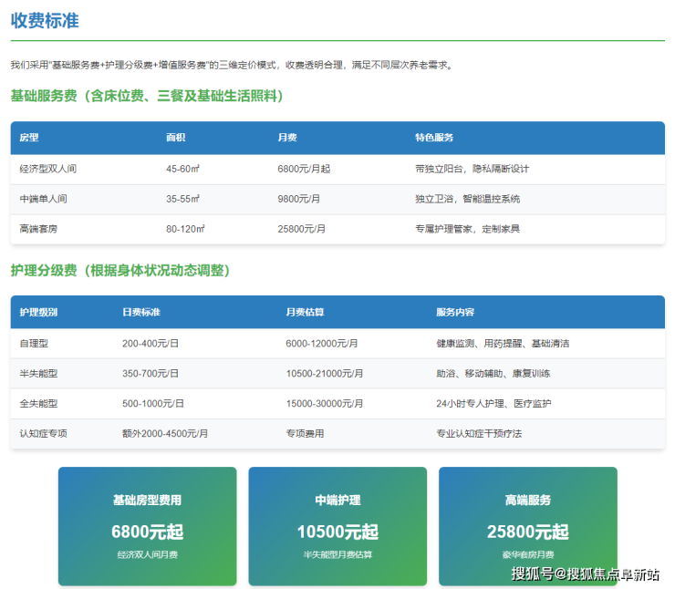 北京懋源天颐康养中心采用"基础服务费+护理分级费+增值服务费"的透明收费模式,具体收费标准如下: