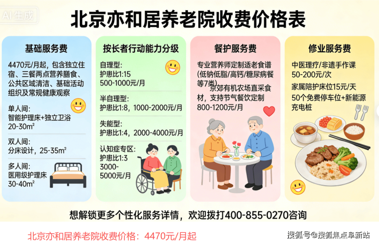 北京亦和居养老院收费价格:4470元/月起,根据房型(单人间、双人间、多人间)及护理等级(基础护理、半失能护理、失能护理、认知障碍专项护理)差异化定价。具体收费内容如下: