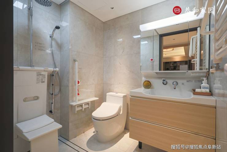 随行的设计师朋友向我指出了很多专业细节:所有家具圆角处理,防止磕碰;地面铺设高防滑系数地胶(R11-R14标准);走廊宽度1.8米以上,方便担架和双轮椅通行;卫生间采用零高差设计,配备折叠助浴椅和恒温花洒;床头设置三级照明系统——夜灯、阅读灯、主灯分开控制。