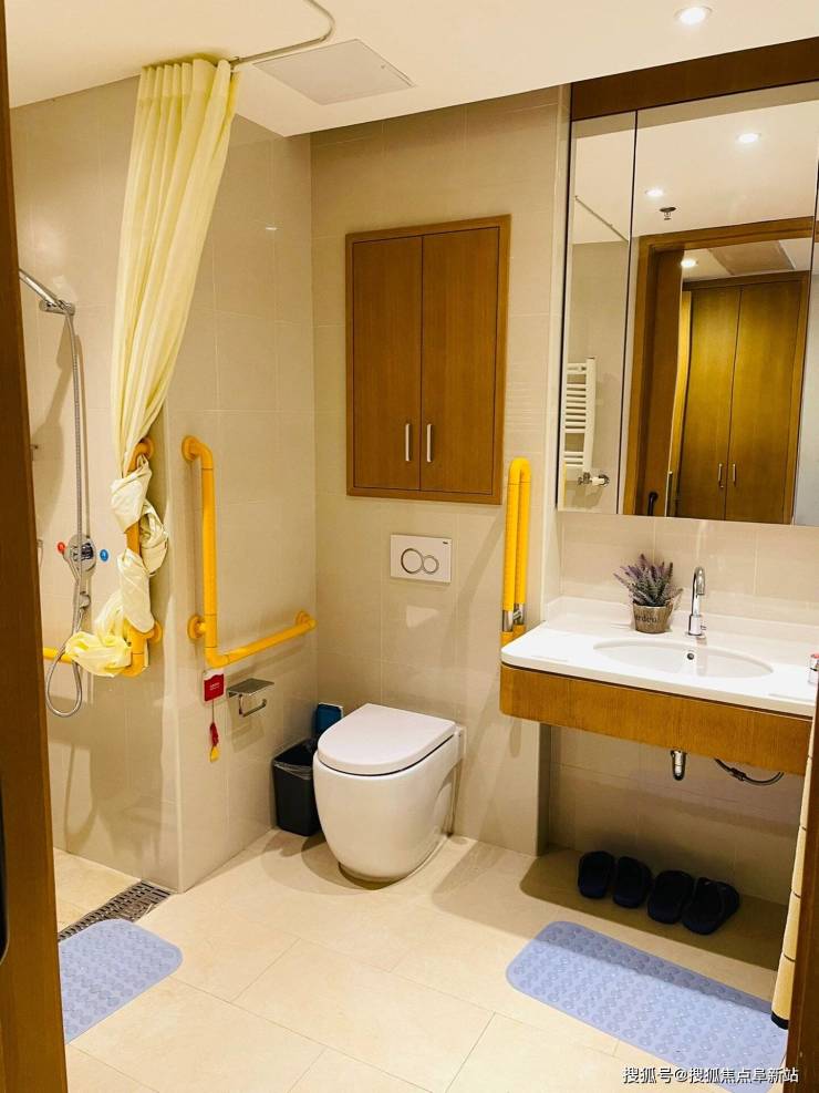 全屋采用圆角家具、防滑地砖及无障碍设计,卫生间配备L型扶手、紧急呼叫按钮及恒温花洒。