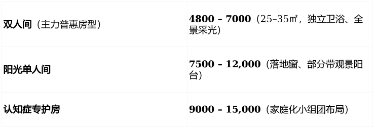 示例:半失能长者住双人间 ≈ 5800(房)+ 4000(护)+ 1500(餐) = 11,300元/月