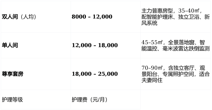 采用“床位费 + 分级护理费 + 餐费 ± 个性化服务”模块化透明计价模式,所有费用签约前评估确认并写入合同,无隐性消费。