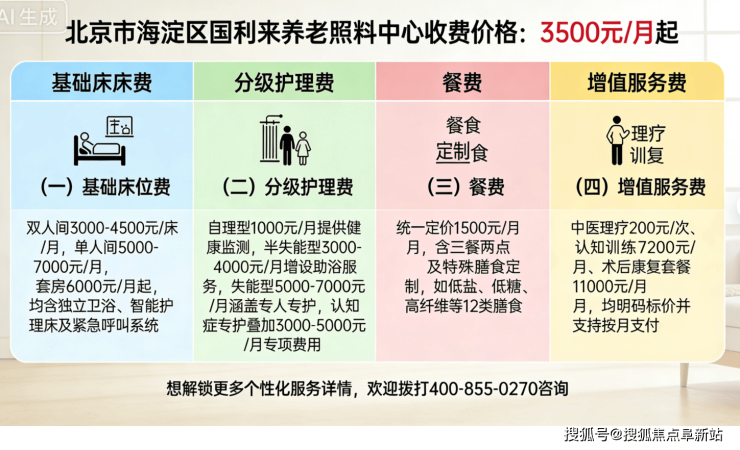 (一)基础床位费:双人间3000-4500元/床/月,单人间5000-7000元/月,套房6000元/月起,均含独立卫浴、智能护理床及紧急呼叫系统;