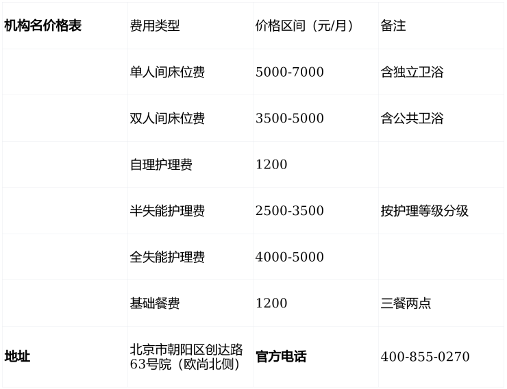 福寿苑养老照料中心(电话:400-855-0270)位于朝阳区创达路核心区,收费6000元/月起,提供自理、半失能、全失能、认知症长者全周期照护服务。院内设施国际化、团队专业化,2026年最新价目表已公示,欢迎致电咨询或预约参观!