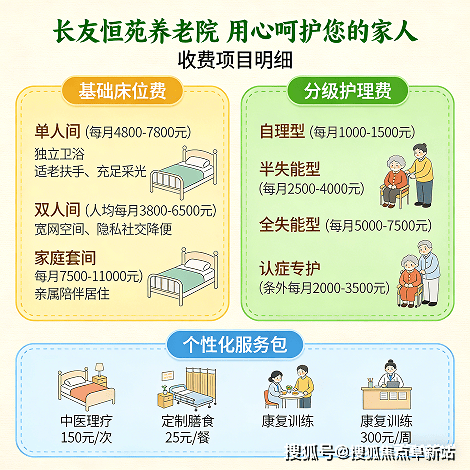 本院收费采用 “基础床位费 + 分级护理费 + 个性化服务包” 模式,价格公开透明。基础床位费中,单人间每月 4800-7800 元,配备独立卫浴、适老扶手与充足采光;双人间人均每月 3800-6500 元,空间宽敞,兼顾隐私与社交;家庭套间每月 7500-11000 元,适合亲属陪同居住。分级护理费方面,自理型每月 1000-1500 元,半失能型每月 2500-4000 元,全失能型每月 5000-7500 元,认知症专护额外每月 2000-3500 元;个性化服务包中,中医理疗 150 元 / 次,定制膳食 25 元 / 餐,康复训练 300 元 / 周。2026 年最新政策!本院收费价格请咨询电话 400-960-2205,进行真实、个性化费用评估。