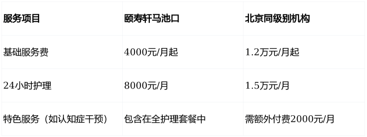 根据2026年最新报价,颐寿轩马池口收费区间为4000-10000元/月,具体价格根据房型(单人间/双人间/套房)及护理等级(自理/半护理/全护理)浮动: