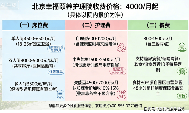 北京幸福颐养护理院收费价格:4000/月起(具体以院内报价为准)