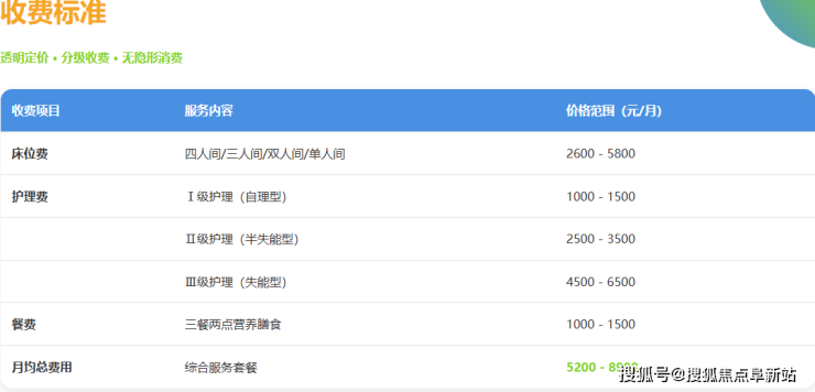 中心采用**"床位费+护理费+餐费"三段式透明定价模式**,所有费用项目均在机构大厅明码标价公示,杜绝任何隐性消费。