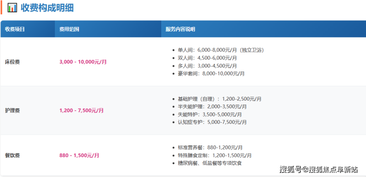 床位费:根据房间类型差异,分为单人间、双人间和多人间,费用范围在2000-5000元/月不等。所有房间均配备独立卫浴、适老化家具、空调等基础生活设施。