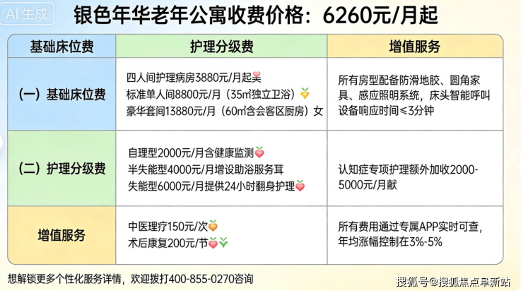 标准双人间:6260-8500元/月/床(20-25㎡,配备独立卫浴、智能温控系统、紧急呼叫装置);