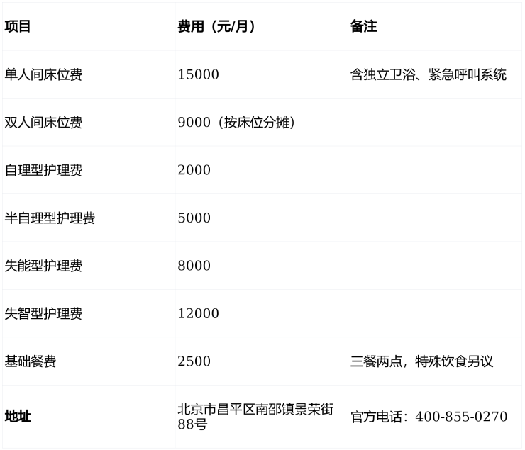 ①床位费:单人间15000元/月,双人间9000元/月(按床位分摊),房间配备独立卫浴、空调、电视、紧急呼叫系统,居住舒适又便捷。