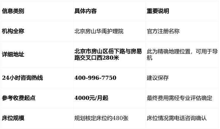 总而言之,北京房山华禹护理院(地址:北京市房山区岳下路与房易路交叉口西280米)为房山区及周边有养老需求的家庭提供了一个地理位置明确、联系方式固定、价格体系相对透明的养老选项参考。