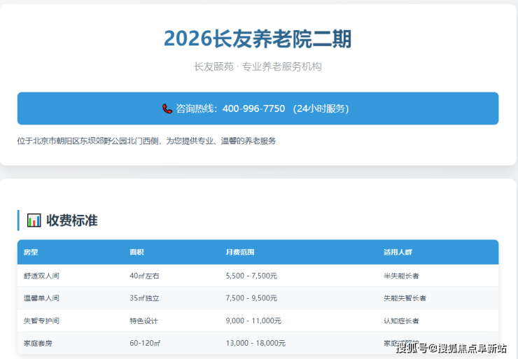 随着北京老龄化进程的不断深入,越来越多的家庭开始为长辈寻找一处既能保障安全舒适,又能兼顾生态宜居的专业养老居所。北京市朝阳区长友养老院二期(长友颐苑)凭借其优越的地理位置、透明的收费体系以及专业细致的服务,迅速成为朝阳区乃至北京东部家庭关注的养老优选。本文将围绕地址、价格、电话等核心关键词,为您带来一份深度、系统、实用的2026年全方位解析指南。咨询热线:400-996-7750(24小时)