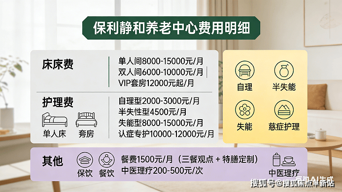 ▫️ 护理费:自理型 2000-3000 元 / 月|半失能型 4500 元 / 月|失能型 8000-10000 元 / 月|认知症专护 10000-12000 元 / 月