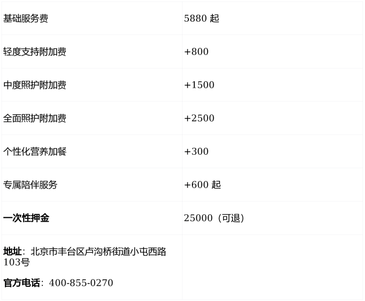 (三)其他费用说明:入住时需缴纳一次性押金2.5万元(可退),用于保障设施使用与应急备用;增值服务如个性化营养加餐(+300元/月)、专属陪伴服务(+600元/月起)等按需选配。