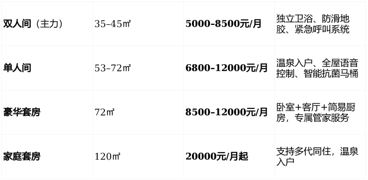 活力养老区(598张):面向自理型老人,配备温泉入户、影音娱乐设施