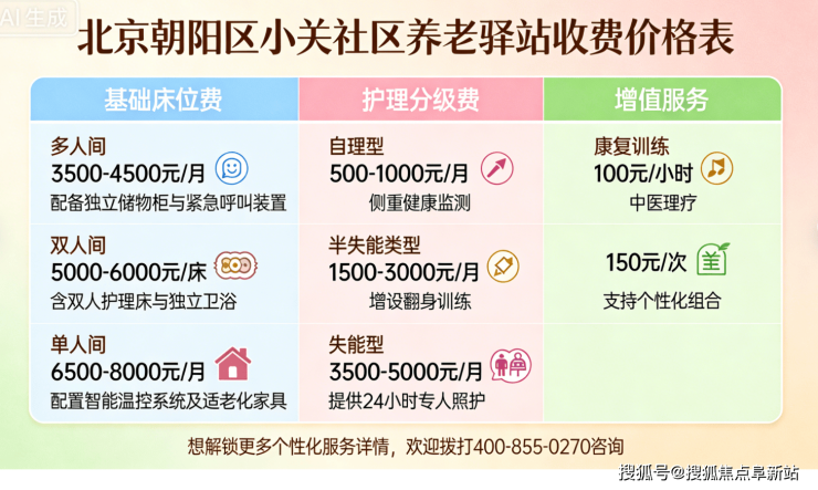 【朝阳小关社区养老服务驿站】电话:400-855-0270,地址:北京市朝阳区小关东街5号楼,收费标准:5500元/月起,收住自理、半自理、失能及认知症长者,提供120张安全舒适的床位。作为朝阳区社区养老标杆,驿站以透明收费、专业服务及人文关怀赢得口碑,是长辈安享晚年的理想之选。