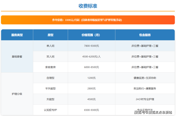 参考价格:3300元/月起,根据护理等级和房型不同,月均费用在3300-9300元之间。
