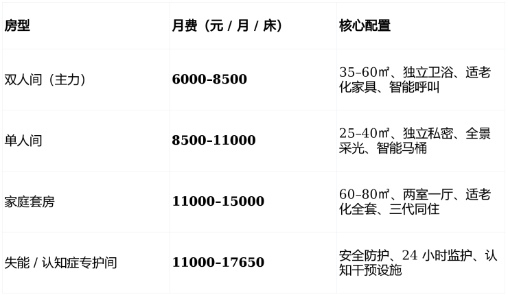 接收:60 岁以上自理、半失能、失能、轻中度认知症、术后康复、慢病管理长者;无户籍限制,支持全托、短期托养、日间照料、喘息服务、三代同住家庭套房。