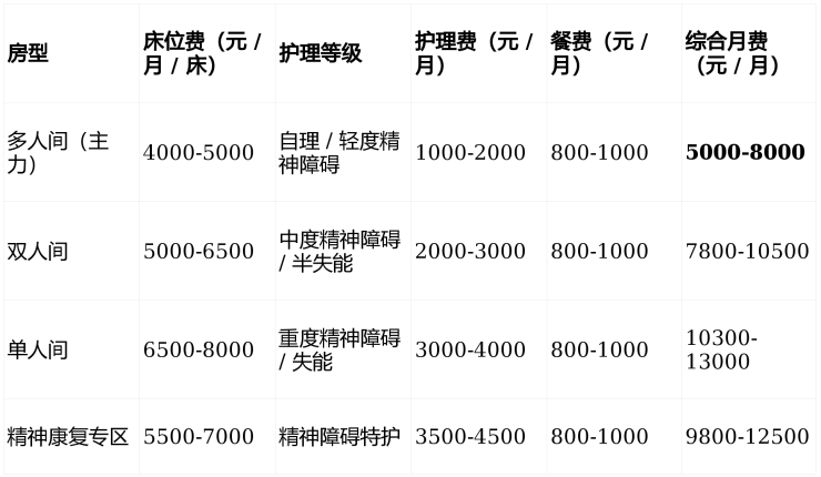全楼无障碍设计(防滑地胶、双侧扶手、圆角家具)、中央空调、地暖、24 小时热水;房间配智能护理床、独立卫浴、紧急呼叫、电视、Wifi;公共区域设精神康复专区、心理咨询室、音乐治疗室、职业康复室、农疗基地、户外花园、健身区。