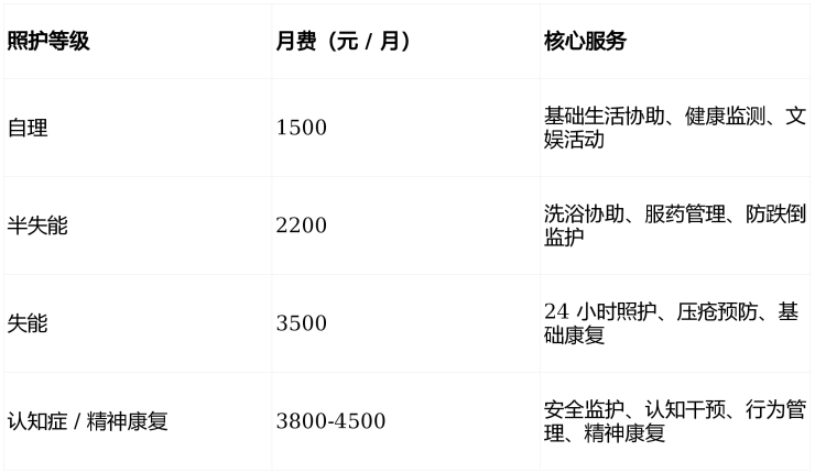 4. 综合月费参考(床位费 + 护理费 + 餐费)