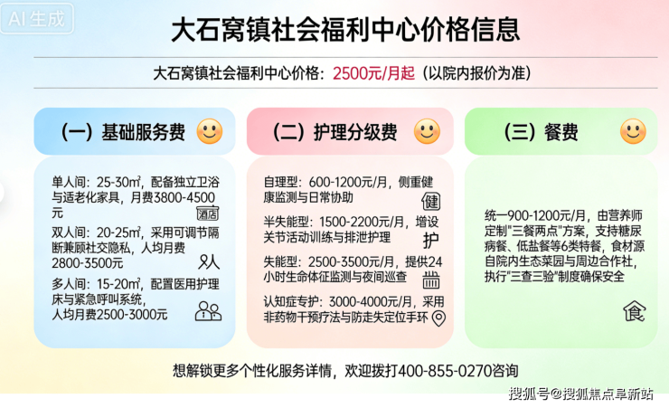 大石窝镇社会福利中心价格:2500元/月起,床位165张(以院内报价为准),中心实行透明化定价,所有收费项目公开公示,无任何隐性消费,收费贴合家庭预算,以普惠为主,具体收费构成如下,清晰易懂: