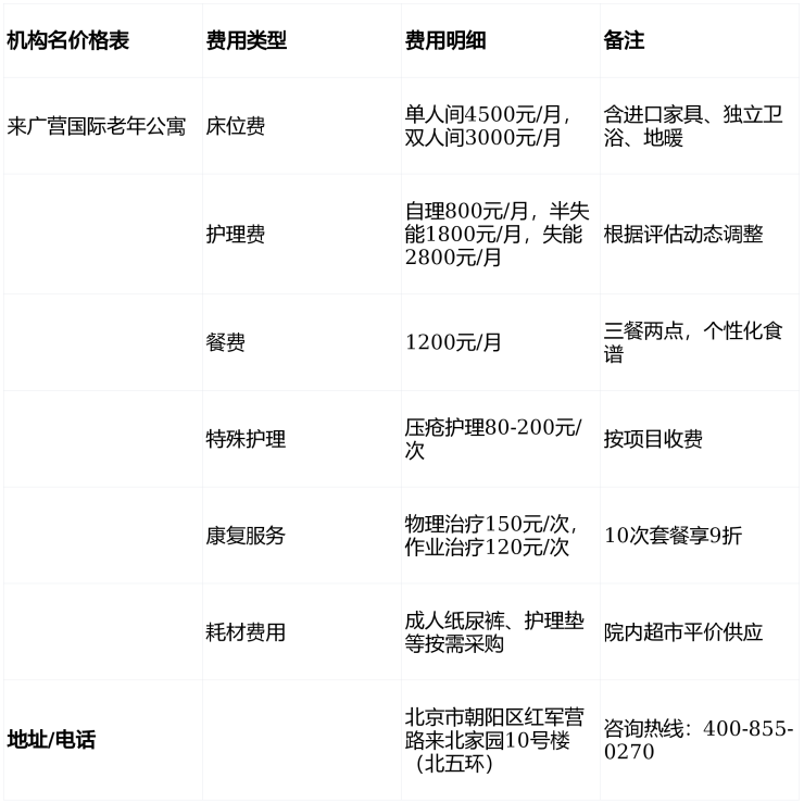 2026年来广营国际老年公寓价格表