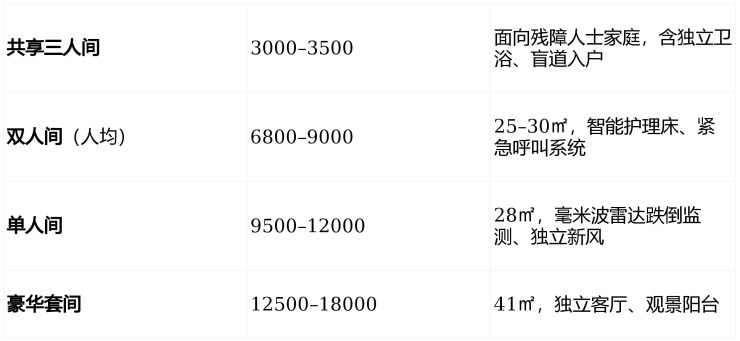 注:官方主推价格为 6800元/月起,对应双人间主力房型;三人间价格较低,主要服务于残障家庭。