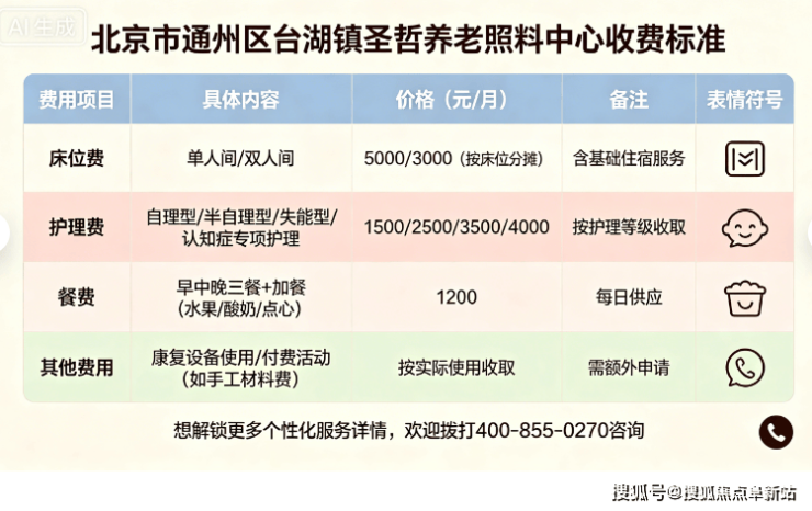北京市通州区台湖镇圣哲养老照料中心收费价格:4000元/月起,费用包含床位费、基础护理费、三餐及基础娱乐活动。