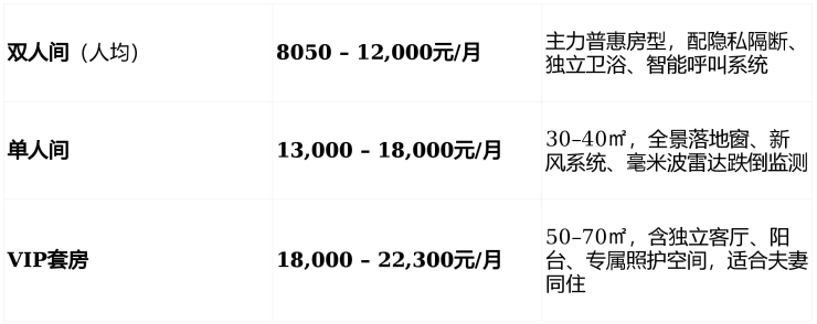 采用“房型费 + 专业照护费 + 餐费”模块化透明计价,所有费用签约前评估确认,无隐性消费。