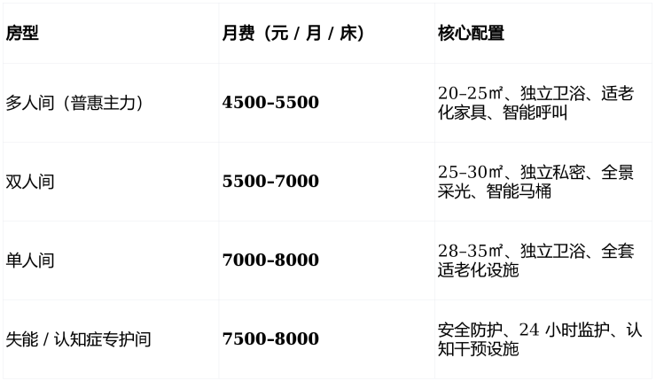 接收:60 岁以上自理、半失能、失能、轻中度认知症、术后康复、慢病管理长者;无户籍限制,支持全托、短期托养、日间照料、喘息服务。