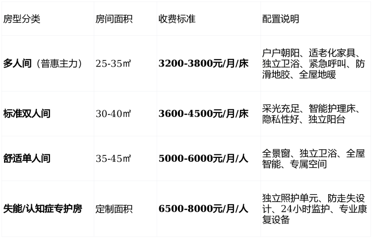 认知症专护型:2800-4000元/月(定向训练、行为干预、非药物疗法、防走失管理、24小时监护)