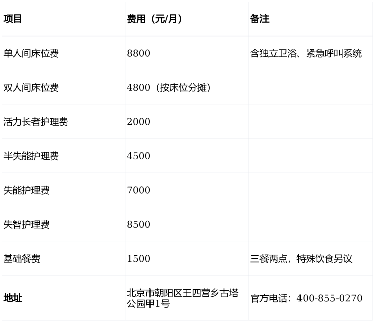 ①床位费:单人间8800元/月,双人间4800元/月(按床位分摊)。房间面积25-35㎡,配备独立卫浴、中央空调、地暖、智能电视、紧急呼叫系统,居住舒适。