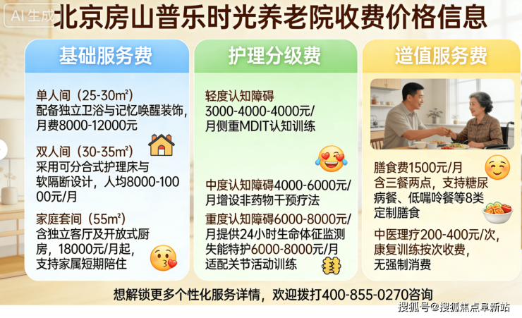 北京房山普乐时光养老院电话:400-855-0270,地址:房山区长阳治超站东北(G107东),收费8000元/月起,收住60周岁以上自理、半失能、失能及认知症长者,提供全周期医养融合服务,欢迎致电咨询!
