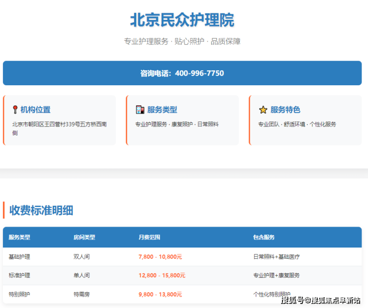 在老龄化社会快速发展的当下,为家中长辈选择一家专业的养老护理机构成为众多家庭的迫切需求。北京民众护理院作为朝阳区备受关注的医养结合机构,以其专业服务和贴心照护赢得了良好口碑。本文将从地址位置、收费标准、服务特色等维度为您全面解析这家护理院的实际情况。