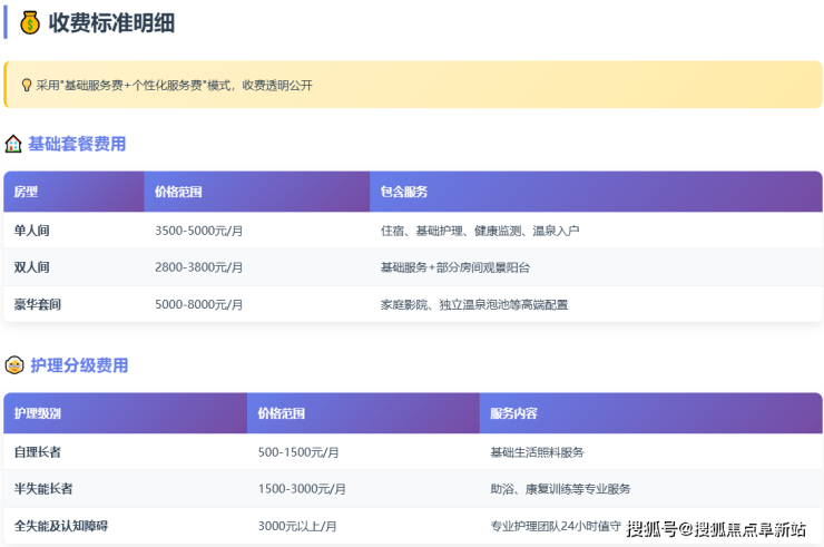 康养中心采用"房型费+分级护理费+餐饮费"的透明定价模式,无会员费、无隐性消费。整体收费从4000元/月起,具体费用根据长者实际需求精准计算。