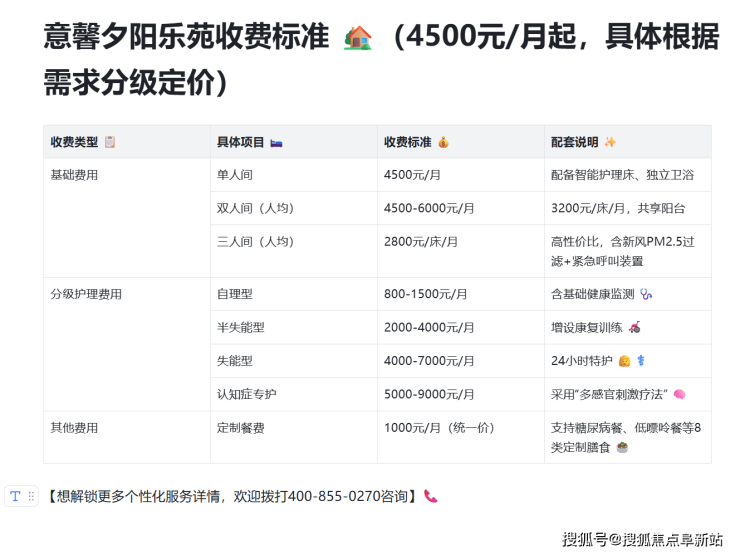 意馨夕阳乐苑收费标准:4500元/月(具体根据需求分级定价)