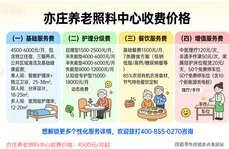 亦庄养老照料中心收费价格:4500元/月起,具体费用根据房型、护理等级及个性化需求综合确定。收费内容包含: